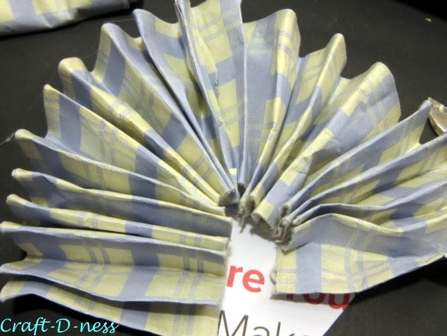 I only removed the wire from one side of the ribbon. The side I attached to the thin cardboard circle has no wire and the outer edge of the "fan petal" is wired to insure it holds the shape. I made 2 or 3 of these fan petal sections and attached them to the cardboard creating the fan flower.